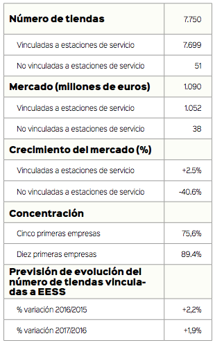 En un contexto de buen comportamiento de los indicadores de actividad económica en general y de los relativos al tráfico por carretera en particular, se estima que el valor del mercado en el segmento de tiendas vinculadas a estaciones de servicio finalice 2016 con un aumento algo superior al 2%, hasta situarse en unos 1.075 millones de euros.