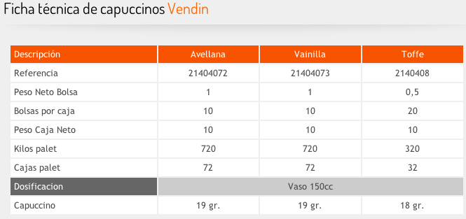 Principales características de nuestros Cappuccinos Estos productos no necesitan mezcla y vienen preparados para toda clase de máquinas automáticas. Su presencia, sabor, y buena dosificación harán que sus clientes tengan una alternativa más a elegir entre los productos habituales como el café con leche o cacao. Nuevos sabores: Vainilla, Avellana, Caramelo y Irish. Todos estos productos junto con nuestro Toffee componen la gama más amplia del mercado en cuanto a variedad y sabor. Ventajas del producto Sabores únicos para complacer a los amantes del cappuccino. Un público objetivo joven con inquietudes en nuevos sabores. Posibilidad de mayor margen sobre ventas por consumición.