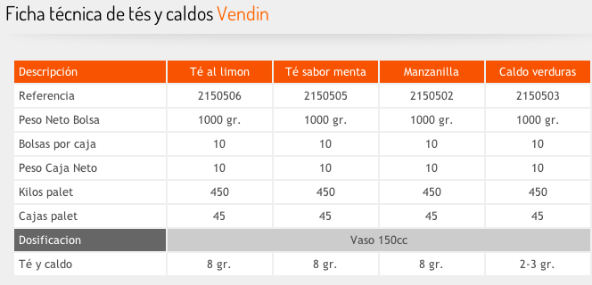 Principales características de nuestros Caldos y Tés Productos solubles instantáneos con extractos y aromas naturales, procedentes de materias primas de primera calidad seleccionadas desde el origen. Especialmente preparados para el funcionamiento de las máquinas automáticas de vending, con una dosificación y solubilidad óptimas. Variedad de sabores Té al limon Té sabor menta. Té de hierbabuena Manzanilla