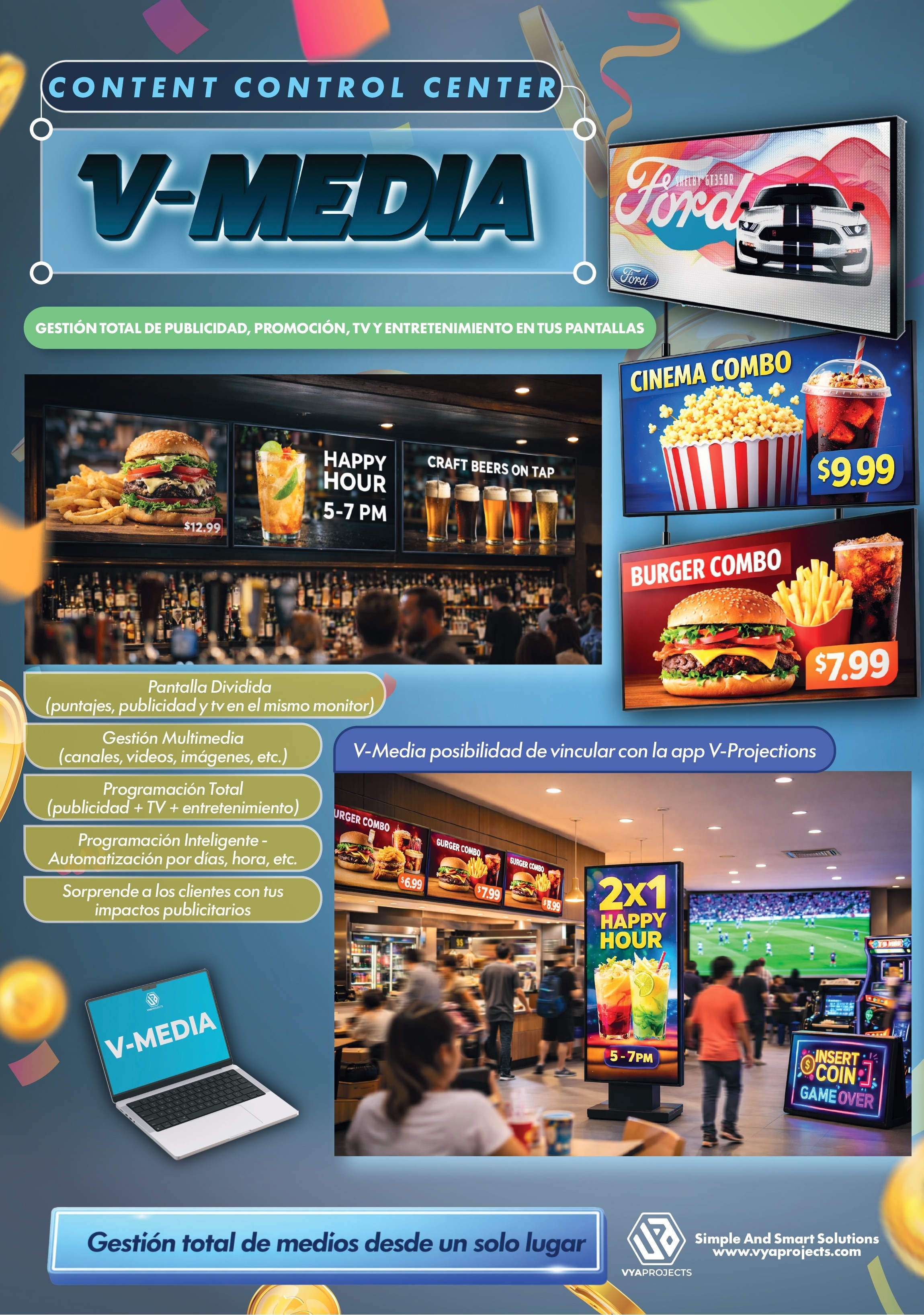 V-Media permite programar publicidad, promociones y entretenimiento de forma centralizada, automatizar campañas por horarios y mejorar la experiencia del cliente, convirtiendo cada pantalla en un canal activo de generación de ingresos.